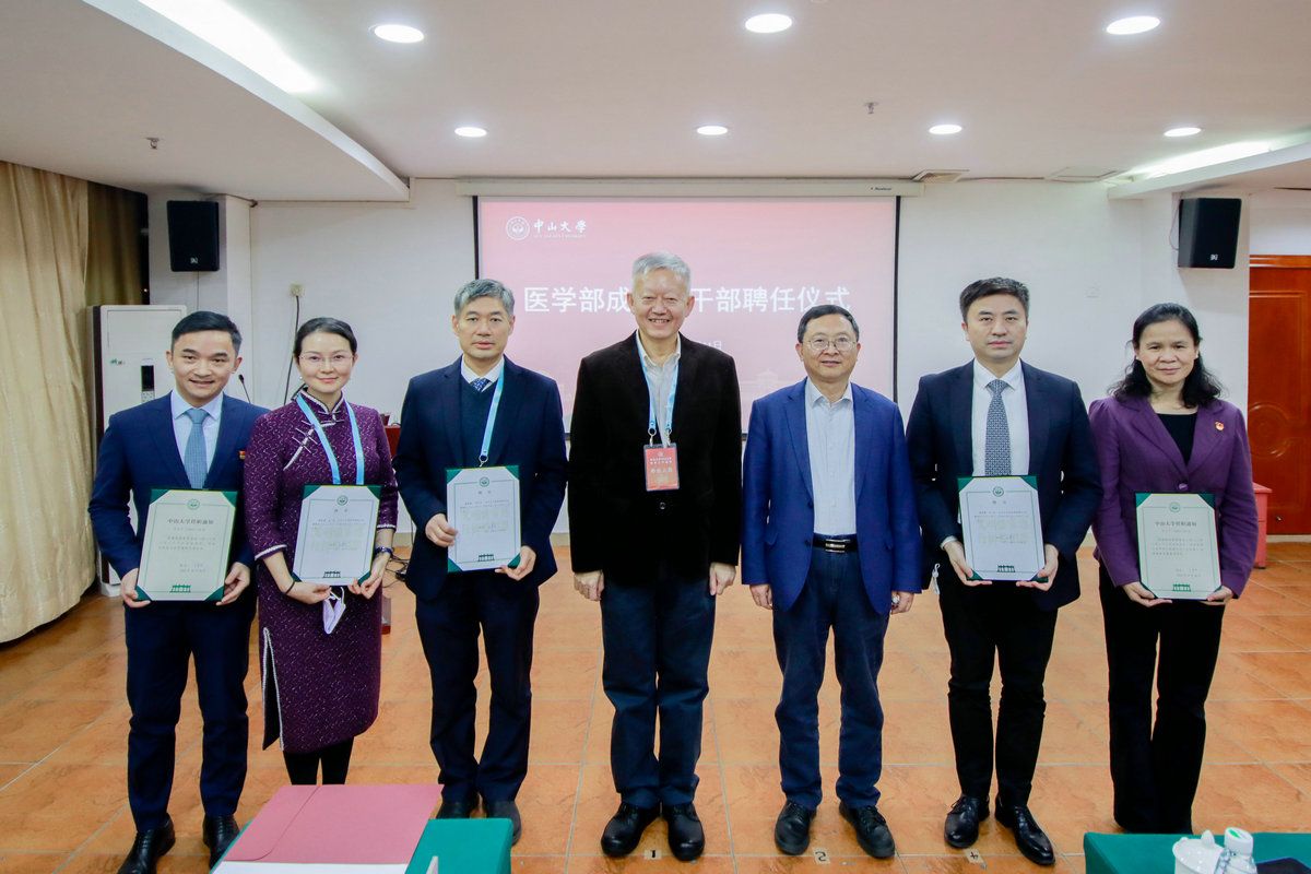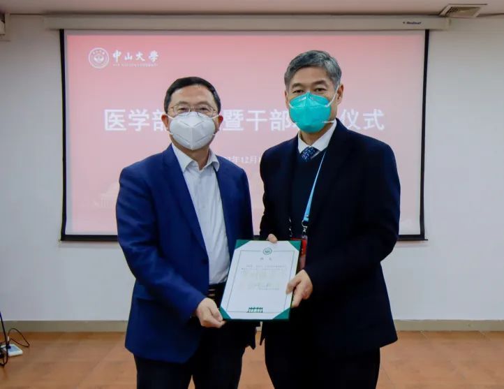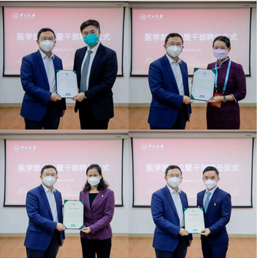 中國科學(xué)院院士、中山大學(xué)校長高松為到場的醫(yī)學(xué)部主任、副主任,醫(yī)學(xué)部內(nèi)設(shè)處室領(lǐng)導(dǎo)人員頒授聘書和干部任命書。