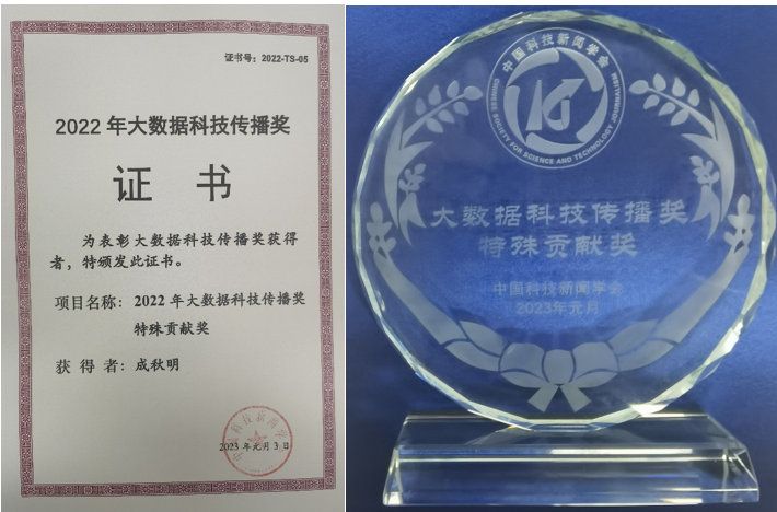 鑒于成秋明院士在我國(guó)科技領(lǐng)域、科技成果轉(zhuǎn)換中的杰出貢獻(xiàn),以及在國(guó)內(nèi)外大數(shù)據(jù)與科技傳播領(lǐng)域中的重要影響和作用,受本屆評(píng)委會(huì)審慎推薦和嚴(yán)格評(píng)審審定,其獲得“2022年大數(shù)據(jù)科技傳播獎(jiǎng)特殊貢獻(xiàn)獎(jiǎng)”。據(jù)悉,本次還評(píng)審出作品獎(jiǎng)9項(xiàng),團(tuán)體獎(jiǎng)13項(xiàng),個(gè)人獎(jiǎng)28名。