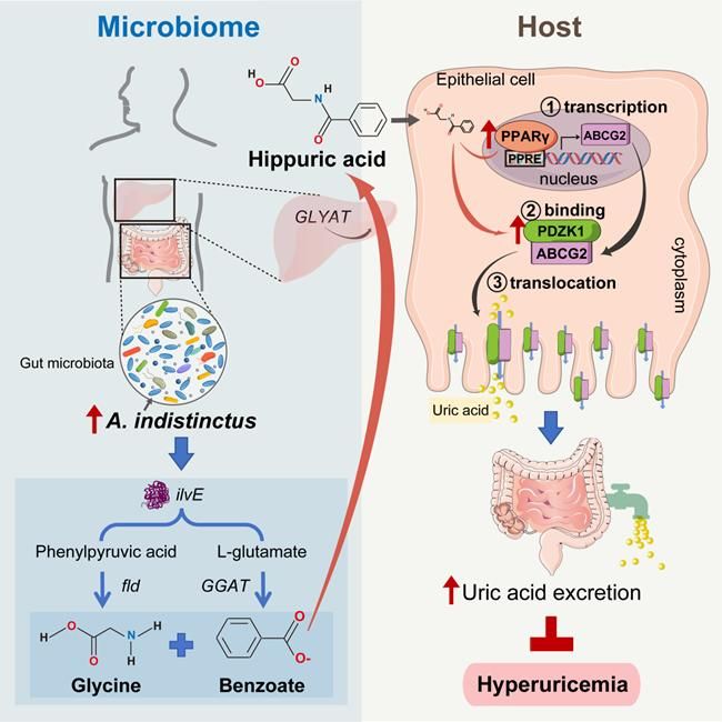 該研究首先通過跨隊(duì)列宏基因組學(xué)分析發(fā)現(xiàn)共生菌A. indistinctus相對(duì)豐度和中心地位在高尿酸血癥患者中明顯降低,A. indistinctus豐度低的人群罹患高尿酸血癥的可能性增加26%。進(jìn)一步的計(jì)算機(jī)模擬分析(in silico analysis)、多組學(xué)聯(lián)合分析、以及分子生物學(xué)實(shí)驗(yàn)證實(shí)了馬尿酸是A. indistinctus發(fā)揮降尿酸作用的關(guān)鍵效應(yīng)分子。A. indistinctus在腸道成功定植后,一方面可通過促進(jìn)過氧化物酶體增殖物激活受體γ(PPARγ)與小腸尿酸轉(zhuǎn)運(yùn)受體ABCG2啟動(dòng)子區(qū)域結(jié)合的方式上調(diào)ABCG2表達(dá),另一方面還可促進(jìn)PDZ含域1(PDZK1)與ABCG2結(jié)合形成二聚體,將ABCG2從胞漿轉(zhuǎn)運(yùn)至小腸上皮細(xì)胞刷狀緣膜,從而增強(qiáng)腸道尿酸排泄能力。該研究首次從菌群——宿主共代謝的角度解析了尿酸代謝穩(wěn)態(tài)調(diào)控新機(jī)制,為高尿酸血癥早期防治措施的建立提供了新思路。相關(guān)研究成果獲批國家發(fā)明專利1項(xiàng)。