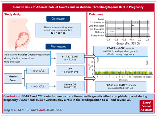 2024年4月11日,中山大學(xué)公共衛(wèi)生學(xué)院(深圳)劉斯洋副教授團(tuán)隊(duì)聯(lián)合深圳市龍崗區(qū)婦幼保健院與深圳市寶安區(qū)婦幼保健院,在Blood期刊上發(fā)表了題為“Genetic basis of pregnancy-associated decreased platelet counts and gestational thrombocytopenia”的研究論文,首次揭示了妊娠期血小板計(jì)數(shù)的變化和GT的遺傳基礎(chǔ)。