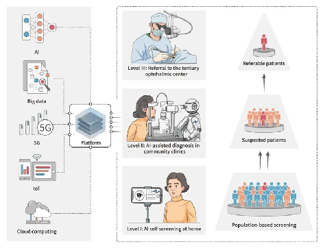 “新型三級診療模式”依托人工智能、大數(shù)據(jù)、5G、物聯(lián)網(wǎng)與云計(jì)算等數(shù)字化智能技術(shù),共分為三個(gè)步驟。第一步,居民在家使用智能移動終端拍攝眼部照片,通過AI完成眼病的初步篩查。第二步,可疑患者將被引導(dǎo)至社區(qū)衛(wèi)生服務(wù)中心進(jìn)行AI檢查評估。第三步,需轉(zhuǎn)診的患者將被轉(zhuǎn)至三級專科醫(yī)院進(jìn)行治療。此模式將大大減少篩查成本,并可避免不必要轉(zhuǎn)診造成的醫(yī)療資源浪費(fèi),有效提升優(yōu)質(zhì)醫(yī)療資源利用效率,指導(dǎo)高效開展基于人群的大規(guī)模白內(nèi)障篩查。
