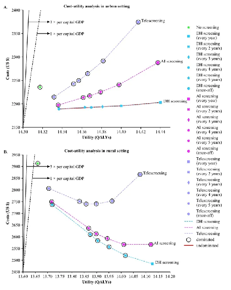 作為國內(nèi)一流高等學(xué)府,中山大學(xué)積極探索醫(yī)學(xué)+多學(xué)科“醫(yī)+X”交叉發(fā)展模式,致力于推動醫(yī)學(xué)研究與實(shí)踐創(chuàng)新。針對目前眼病診療資源不足及分布不均衡的結(jié)構(gòu)性難題,中山大學(xué)中山眼科中心林浩添教授團(tuán)隊(duì)與計(jì)算機(jī)學(xué)院潘嶸副教授團(tuán)隊(duì)合作,基于前期創(chuàng)建的數(shù)字智能技術(shù)“居家自篩-社區(qū)篩查-醫(yī)院轉(zhuǎn)診”的“新型三級診療”模式,從衛(wèi)生經(jīng)濟(jì)學(xué)角度驗(yàn)證了新模式在中國城鄉(xiāng)均具有成本效益,且每年篩查成本效益最優(yōu)。該研究結(jié)合我國現(xiàn)狀從城市和農(nóng)村多角度為中國人群推薦最優(yōu)的白內(nèi)障篩查策略,為經(jīng)濟(jì)、高效篩診常見致盲眼病提供新思路,為政府有關(guān)部門制定眼病防治公共衛(wèi)生策略提供依據(jù)。研究成果以“Cost-effectiveness and cost-utility of a digital technology-driven hierarchical healthcare screening pattern in China”為題,于2024年4月30日在高水平期刊Nature Communications(中科院一區(qū),IF=16.6)在線發(fā)表。
