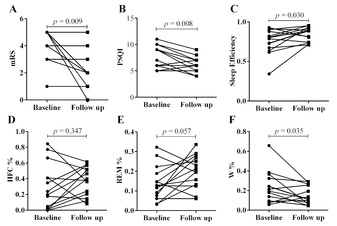 圖2 基線和隨訪時(shí) mRS、PSQI 評分和 CPC 變量的比較。隨訪時(shí)mRS 評分和 PSQI 評分下降;隨訪時(shí),CPC參數(shù)中的睡眠效率增加(0.89 [0.76, 0.91] vs. 0.79 [0.69, 0.86],p=0.030),覺醒降低(0.11 [0.08;0.24] vs. 0.20 [0.11;0.30], p=0.0353),REM、HFC、LF/HF等改善不明顯。