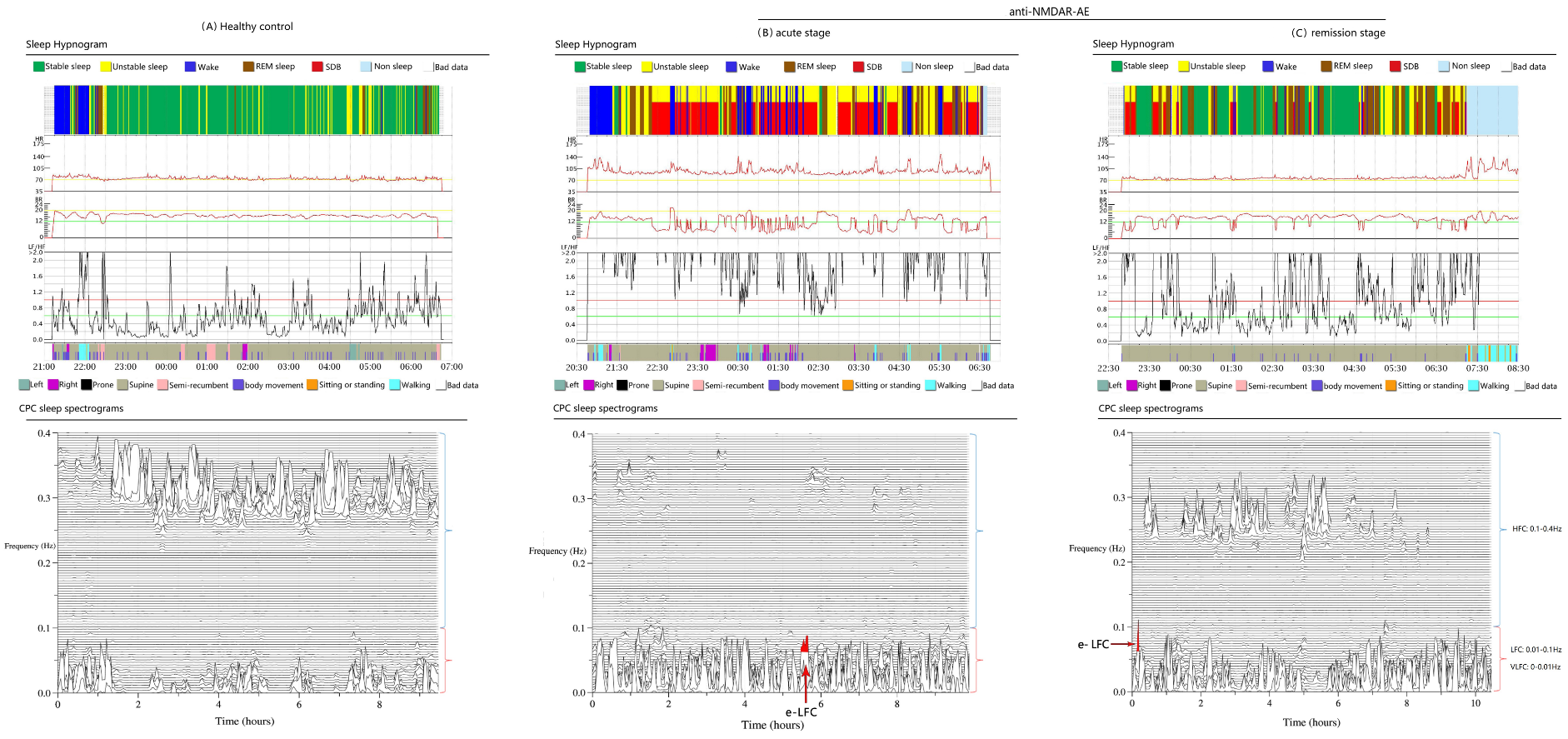 近日,中山大學(xué)附屬第三醫(yī)院腦病中心神經(jīng)免疫團(tuán)隊(duì)在神經(jīng)病學(xué)知名期刊Neurology(中科院一區(qū),Top,IF=9.9)發(fā)表了題為“Cardiopulmonary coupling spectrogram as an ambulatory method for assessing sleep disorders in patients with autoimmune encephalitis”的研究論文。該研究創(chuàng)新性地將CPC用于AE的睡眠評價(jià),并發(fā)現(xiàn)了AE的睡眠評估標(biāo)志物,拓展了AE睡眠障礙的評估思路。該評估方法具有便攜、簡易、高效的特點(diǎn),有望與其他生物標(biāo)志物共同構(gòu)建病情觀測、療效評價(jià)、預(yù)后判斷的多維度監(jiān)測體系。