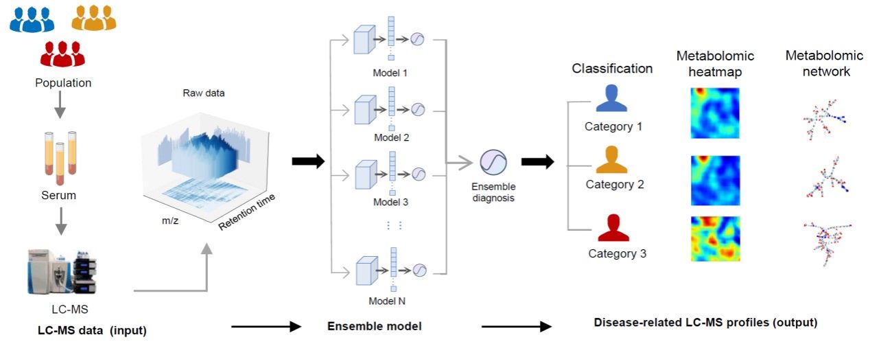 2024年8月20日,中山大學(xué)中山醫(yī)學(xué)院李偉忠團(tuán)隊(duì)與中山大學(xué)腫瘤防治中心黃蓬、胡寓旻團(tuán)隊(duì)合作,在Nature Communications發(fā)表了題為An end-to-end deep learning method for mass spectrometry data analysis to reveal disease-specific metabolic profiles 的研究成果。該研究開創(chuàng)性地提出可解釋性集成深度學(xué)習(xí)方法DeepMSProfiler,可端對(duì)端地進(jìn)行非靶向代謝組學(xué)數(shù)據(jù)分析。DeepMSProfiler方法能夠直接將原始的LC-MS下機(jī)數(shù)據(jù)轉(zhuǎn)換為樣本所屬疾病類別、疾病相關(guān)的關(guān)鍵代謝物和疾病相關(guān)的代謝物-蛋白質(zhì)網(wǎng)絡(luò)等結(jié)果,提供了全面的疾病相關(guān)代謝組圖景。DeepMSProfiler無需使用傳統(tǒng)的代謝組學(xué)分析過程中的峰提取和識(shí)別步驟,從而避免了復(fù)雜分析過程中的誤差累積,更充分地利用了根據(jù)現(xiàn)有數(shù)據(jù)庫無法鑒定出來的未知代謝信號(hào)。重要的是,DeepMSProfiler有效地克服了來自不同醫(yī)院之間的批次效應(yīng)問題。
