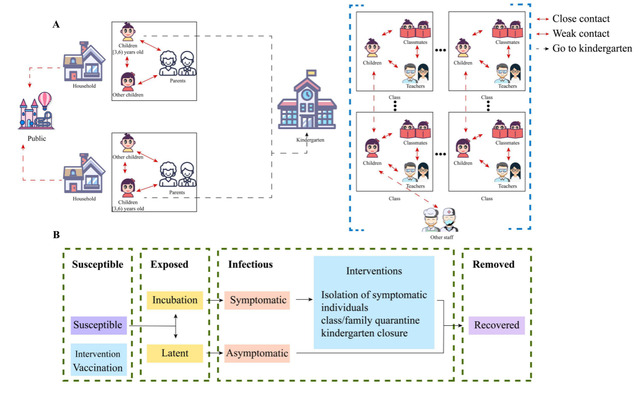 研究圖形摘要:模型結(jié)構(gòu) A:接觸圖;B:傳播模型及干預(yù)措施