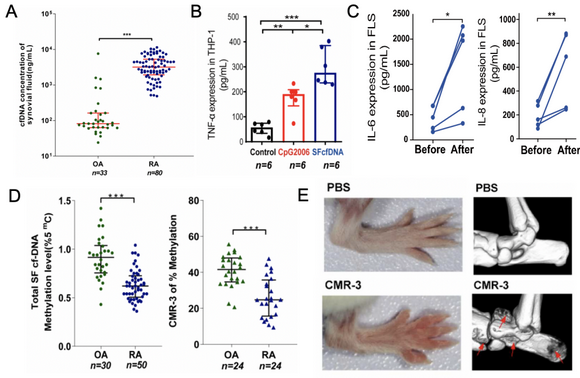 RA患者體內(nèi)存在異常高水平的cfDNA,然而尚未有研究報道明確證明其與RA發(fā)病機理之間的關(guān)系。項目團隊從163例患者樣本中,驗證了RA患者血漿和關(guān)節(jié)積液中的cfDNA含量遠高于對照組,并且刺激RA患者的原代滑液單核免疫細胞和成纖維樣滑膜細胞產(chǎn)生高水平的促炎因子(圖1)。通過全基因組測序和生物信息分析發(fā)現(xiàn),RA患者積液中cfDNA具有特定的富含低甲基化CpG序列。動物實驗顯示,富含低甲基化CpG序列可誘發(fā)小鼠出現(xiàn)顯著的關(guān)節(jié)炎癥和骨侵蝕癥狀。這項工作首次揭示了RA病人cfDNA特異序列結(jié)構(gòu)和炎癥的密切關(guān)系,為RA臨床的診斷和治療提供了新的分子標記。該研究結(jié)果于2020年4月在國際綜合學(xué)術(shù)期刊Frontiers in Immunology上發(fā)表[1]。