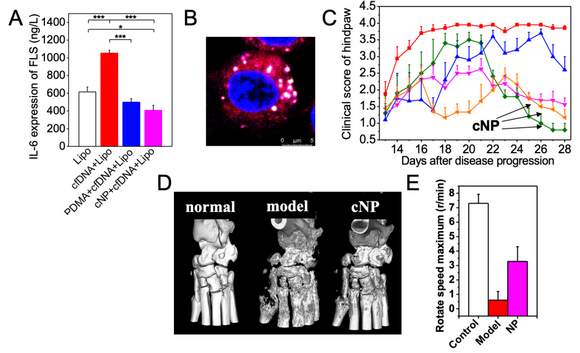 前期該項目團隊提出使用陽離子聚合物材料清除帶負電荷的cfDNA,作為抑制、治療RA的新概念。從細胞和動物模型層次,發(fā)現(xiàn)陽離子納米顆粒(cNP)具有高效結(jié)合核酸的能力,有效抑制cfDNA對病人纖維樣滑膜細胞的活化(圖2)。動物實驗顯示陽離子納米材料易富集到RA模型鼠的炎癥關(guān)節(jié),更好抑制RA模型鼠的炎癥反應(yīng),顯著改善關(guān)節(jié)腫脹、骨和軟骨破壞等癥狀,甚至使晚期RA大鼠恢復(fù)活動能力。該研究在國際綜合學(xué)術(shù)期刊Nature Communications發(fā)表[2]。
