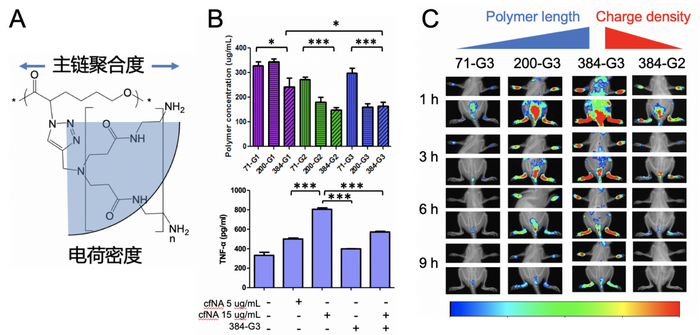 為了克服膠束顆粒在體內(nèi)可能解離產(chǎn)生的不確定性,研究團隊通過調(diào)節(jié)可降解的聚己內(nèi)酯主鏈聚合度、伯胺基型聚酰胺-胺型樹枝狀分子(PAMAM)接枝代數(shù),獲得一個精確調(diào)控電荷密度和分子量的生物可降解陽離子聚合物庫(圖3)。揭示了陽離子聚合物的精確結(jié)與其核酸結(jié)合、毒性、抑制炎癥、小動物體內(nèi)分布的關(guān)系,從而選擇最佳性能材料來有效抑制RA模型鼠的關(guān)節(jié)腫脹、滑膜增生和骨質(zhì)破壞。該研究在國際化學(xué)綜合學(xué)術(shù)期刊Angewandte Chemie International Edition發(fā)表[3]。