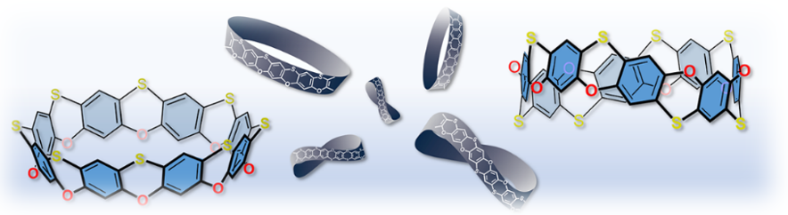 分子帶的精準(zhǔn)合成及其性質(zhì)研究是目前有機(jī)及超分子化學(xué)研究領(lǐng)域最活躍的方向之一。作為碳納米管及富勒烯的構(gòu)筑片段,共軛的碳?xì)浯蟓h(huán)及分子帶展示出獨(dú)特的化學(xué)與物理性質(zhì),使其在新型光電材料、吸附分離及超分子識別與組裝等方面具有重要應(yīng)用價值。大環(huán)分子的合成極具挑戰(zhàn)性,特別是高張力的帶狀大環(huán),存在合成產(chǎn)率低、分離難、不易衍生化等問題,限制了進(jìn)一步的應(yīng)用與發(fā)展。雜原子(N,O,S等)的加入不僅可以實(shí)現(xiàn)大環(huán)結(jié)構(gòu)單元的等電子替換,而且可以改變電子結(jié)構(gòu)性質(zhì),進(jìn)而影響其功能應(yīng)用。盡管目前已有大量的理論計(jì)算研究,而通過雜原子雙橋連接的方式構(gòu)筑分子帶卻鮮有報(bào)導(dǎo)。基于此,我?;瘜W(xué)學(xué)院朱克龍教授和姜隆副教授合作,設(shè)計(jì)并合成了氧、硫原子雙橋連的新型分子帶[8]cyclophenoxathiin,利用氧硫雜蒽結(jié)構(gòu)單元的動態(tài)可彎折性克服分子帶合成的高張力問題;同時,通過氧、硫雜原子對大環(huán)分子帶的電子結(jié)構(gòu)的調(diào)控,實(shí)現(xiàn)其作為分子“容器”的功能應(yīng)用。