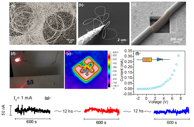 (d) 單根納米電纜在300℃左右?guī)?dòng)紅色發(fā)光二極管工作;(e) 器件襯底的紅外熱成像;