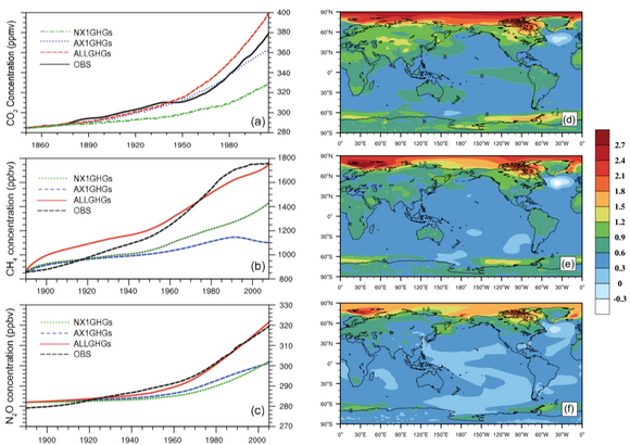 除了人為排放的CO2之外,最重要的人為溫室氣體還包括CH4和N2O等。CH4的重要性僅次于CO2,其排放量占全球人為溫室氣體排放總量的14%,百年全球增溫潛能 (GWP) 是CO2的21倍。其次,全球溫室氣體排放量的8%來源于人為化石燃料燃燒和化肥施用過程中產(chǎn)生的N2O,其GWP約是CO2的310倍。評(píng)估多種溫室氣體共同作用下的氣候變化,對(duì)于完善氣候變化的歷史責(zé)任歸因研究,為氣候談判提供詳實(shí)的理論依據(jù)具有一定的參考價(jià)值。