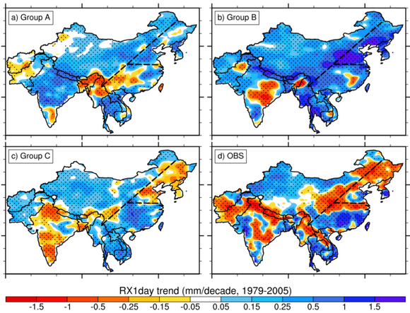 包含直接效應(yīng)+第一間接效應(yīng)+第二間接效應(yīng)的氣候模式(c)和觀測(cè)數(shù)據(jù)(d)在中國和印度的1979-2005年極端降雨趨勢(shì)空間分布圖。