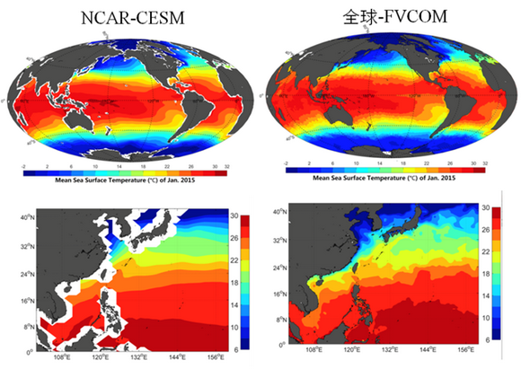 圖3. 2015年1月全球(上)及西太平洋(下)海表溫度,左為美國大氣研究中心-通過耦合地球系統(tǒng)模式模擬結(jié)