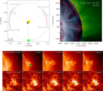 圖4:不同視角對同一暗條爆發(fā)的觀測,可以看出暗條爆發(fā)過程中的旋轉(zhuǎn)