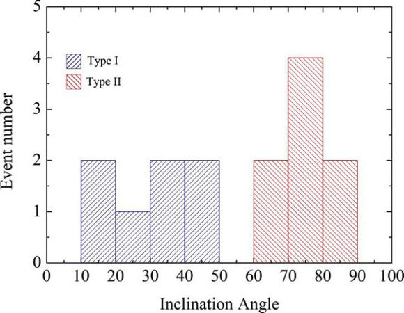 圖2:兩類束縛耀斑中耀斑后環(huán)的傾斜角分布