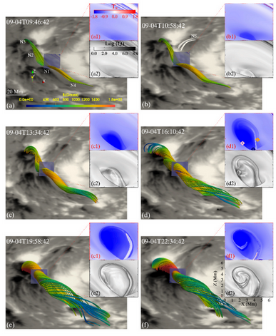 圖1:浮現(xiàn)活動區(qū)中磁繩的形成過程