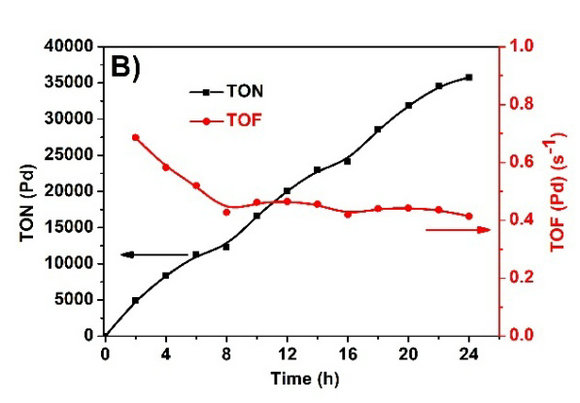 基于Pd催化中心的積累TON和TOF值(可見光照射,l > 420 nm,光強:100 mW/cm2)