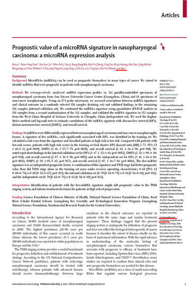 科學(xué)發(fā)現(xiàn)二:發(fā)現(xiàn)特定的一組miRNA標(biāo)簽?zāi)軌蚍从侈D(zhuǎn)移潛能,提高預(yù)后預(yù)測(cè)的準(zhǔn)確性,為精準(zhǔn)治療奠定了基礎(chǔ)。研究結(jié)果于 2012 年發(fā)表在發(fā)表國(guó)際權(quán)威的學(xué)術(shù)期刊《柳葉刀·腫瘤》上,新加坡國(guó)立癌癥中心化療科主任Han Chong Toh教授在Lancet Oncology同期評(píng)述中指出,此論文的研究成果可協(xié)助臨床醫(yī)生更準(zhǔn)確地區(qū)分高風(fēng)險(xiǎn)的患者,從而有針對(duì)性地制定治療方案,為鼻咽癌“個(gè)體化”治療奠定了基礎(chǔ)。同時(shí),該論文被Nature China(推廣中國(guó)優(yōu)秀科學(xué)研究成果的專業(yè)網(wǎng)站)作為亮點(diǎn)研究予以推薦。