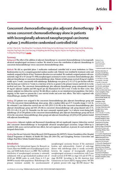 為此,我們團(tuán)隊(duì)牽頭全國(guó)10家3甲醫(yī)院,歷時(shí)8年共同完成了一項(xiàng)前瞻性多中心III期隨機(jī)對(duì)照臨床試驗(yàn),將入組患者隨機(jī)分入TPF誘導(dǎo)化療聯(lián)合同期放化療組(試驗(yàn)組)或同期放化療組(對(duì)照組),比較兩組的生存率及毒副反應(yīng)。該研究在國(guó)際上首次證明誘導(dǎo)化療能夠提高鼻咽癌的療效且治療毒性可以耐受,病人的生存率提高了8%,腫瘤轉(zhuǎn)移的發(fā)生率降低了7%。研究結(jié)果在全球排名第一的腫瘤學(xué)雜志《柳葉刀?腫瘤》發(fā)表。這是近10年來(lái)唯一能夠提高局部晚期鼻咽癌生存率,減少腫瘤擴(kuò)散的3期臨床試驗(yàn),有望在不久的將來(lái)被美國(guó)和歐洲的指南所采納,在全世界推廣應(yīng)用。國(guó)際同行芝加哥大學(xué)醫(yī)學(xué)中心Michael T Spiotto教授發(fā)表同期評(píng)論,認(rèn)為此論文為確立鼻咽癌最佳綜合治療模式提供了高級(jí)別的循證醫(yī)學(xué)證據(jù),也為誘導(dǎo)化療在其它頭頸腫瘤中的應(yīng)用提供了新的研究思路。此外,中國(guó)《健康報(bào)》頭版頭條以《鼻咽癌治療我國(guó)再度領(lǐng)跑》為題進(jìn)行報(bào)道并發(fā)表特約評(píng)論:《領(lǐng)跑者更需要全方位支持》,同時(shí)該項(xiàng)研究成果得到科技日?qǐng)?bào)、中國(guó)醫(yī)學(xué)論壇報(bào)、健康報(bào)、醫(yī)師報(bào)和廣州日?qǐng)?bào)等海內(nèi)外主流媒體10余次正面報(bào)道。