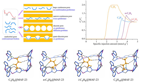 在上述工作的基礎(chǔ)上,研究團(tuán)隊(duì)又提出了“控制柔性客體分子構(gòu)型可反轉(zhuǎn)吸附選擇性”的概念,并對系列代表性多孔配位聚合物進(jìn)行了實(shí)驗(yàn)和計(jì)算機(jī)模擬驗(yàn)證。利用研究團(tuán)隊(duì)前期設(shè)計(jì)合成的多孔配位聚合物MAF-23(J. Am. Chem. Soc.2012, 134, 17380),實(shí)現(xiàn)了反常而且最優(yōu)的C4碳?xì)浠衔镂椒蛛x順序。常溫常壓下將C4碳?xì)浠衔锏幕旌衔锿ㄟ^MAF-23填充的固定床吸附裝置后,丁二烯最先流出而且純度很容易達(dá)到99.9%,同時避免了常規(guī)蒸餾和吸附純化過程中因加熱而產(chǎn)生的丁二烯自聚問題。