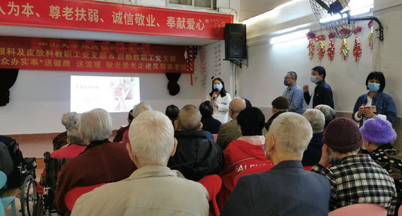 藍(lán)育青教授為老人們開展了眼科疾病科普講座,針對老年人群較常見的白內(nèi)障、黃斑病變、青光眼等眼科疾病進(jìn)行了成因和治療方案的分享。皮膚科黨員熊慧主治醫(yī)師與老人們分享了冬季護(hù)膚、護(hù)膚產(chǎn)品使用和皮膚病用藥的注意事項(xiàng)。