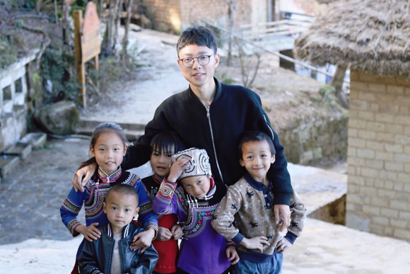 獲評第二批全國高?!鞍倜芯可h員標(biāo)兵”的博士生楊兵同志在阿者科與孩子們的合影(來源:旅游學(xué)院)