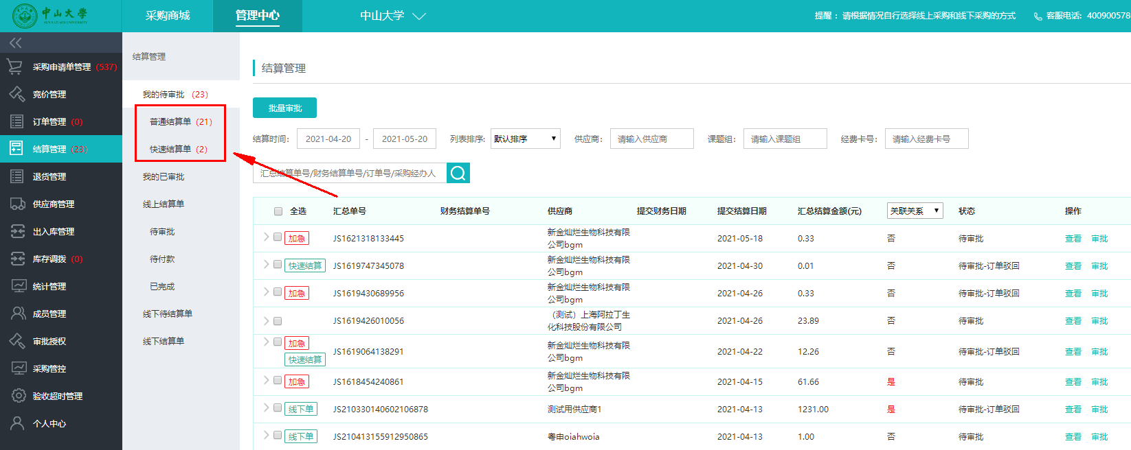 實(shí)驗(yàn)材料采購(gòu)平臺(tái)快速結(jié)算通道和普通結(jié)算通道(來(lái)源:設(shè)備與實(shí)驗(yàn)室管理處)