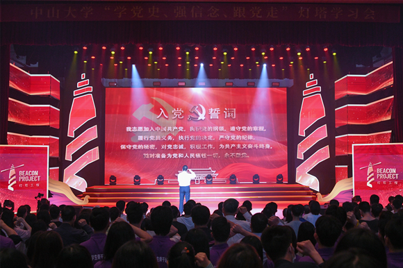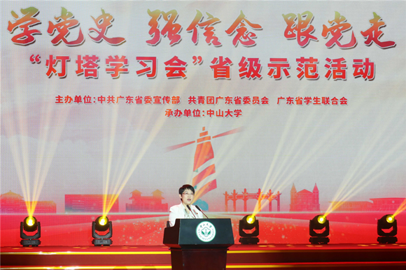 中大新聞網(wǎng)訊(通訊員周晶 趙丹琳 蘇振東)由中共廣東省委宣傳部、共青團(tuán)廣東省委員會、廣東省學(xué)生聯(lián)合會主辦,中山大學(xué)承辦的“學(xué)黨史、強信念、跟黨走”燈塔學(xué)習(xí)會省級示范活動于4月18日在中山大學(xué)廣州校區(qū)南校園梁銶琚堂舉行。中山大學(xué)黨委書記陳春聲,共青團(tuán)廣東省委員會副書記武一婷,中山大學(xué)黨委副書記余敏斌,廣東高校團(tuán)委書記、省級青馬學(xué)員、青年大學(xué)生代表等1000余人參加了此次活動。