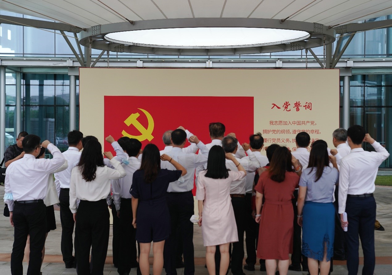 “我志愿加入中國(guó)共產(chǎn)黨,擁護(hù)黨的綱領(lǐng),……”在中國(guó)船舶江南造船百年歷史展前面,陳春聲領(lǐng)誓,羅俊、蘭平等19名黨員同志擲地有聲地再次向著鮮紅的黨旗宣誓。