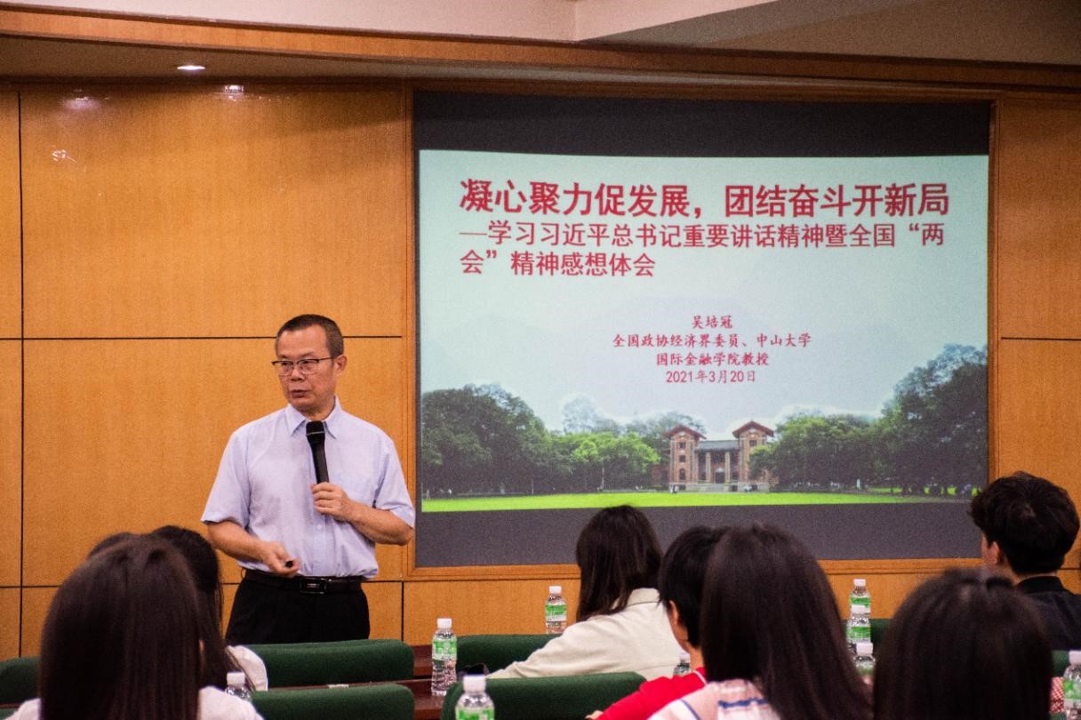 中大新聞網(wǎng)廣州3月24日電(通訊員姜冰)3月20日上午,我校黨委學生工作部組織學生骨干及國旗班學生代表在廣州校區(qū)南校園參加專題報告會,深入學習習近平總書記重要講話精神和全國兩會精神。全國政協(xié)委員、我校國際金融學院吳培冠教授受邀作題為《凝心聚力促發(fā)展 團結(jié)奮斗開新局》的專題報告。