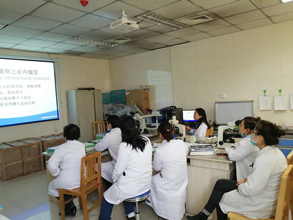 由于種種原因,喀什地區(qū)第一人民醫(yī)院病理規(guī)培基地招生困難。今年,在鄒小廣書記和林天歆院長大力支持下,病理科購置了一臺10人共攬顯微鏡用于帶教。顯微鏡是病理醫(yī)生的另一雙“眼睛”,有了這個重量級的“武器”,科室醫(yī)生也信心大增。