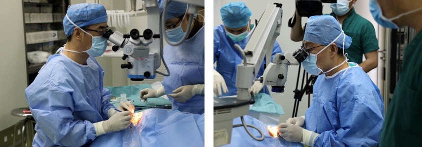 黃文勇(左)、王德才(右)兩位主刀醫(yī)生在玉樹八一醫(yī)院手術(shù)室行白內(nèi)障復(fù)明手術(shù)(來源:中山眼科中心)