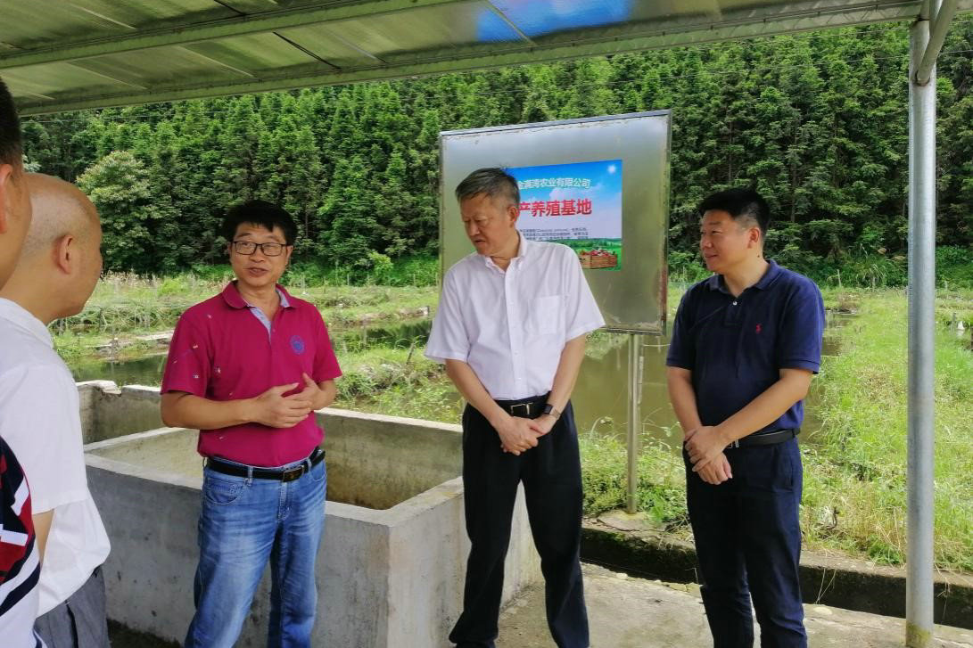 袁劍剛副教授(右三)匯報柯木灣村稻蛙魚產(chǎn)業(yè)基地情況