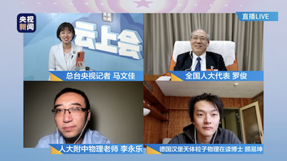 央視新聞兩會(huì)特別節(jié)目《晚八點(diǎn) 云上會(huì)》邀請(qǐng)到中科院院士、中山大學(xué)校長(zhǎng)、我國(guó)空間引力波探測(cè)天琴計(jì)劃首席科學(xué)家羅俊,對(duì)引力波和天琴計(jì)劃進(jìn)行解讀。同時(shí),節(jié)目組還邀請(qǐng)到青年學(xué)者、德國(guó)漢堡大學(xué)天體離子物理專業(yè)在讀博士顧易坤,和羅俊院士一起探討相關(guān)話題。