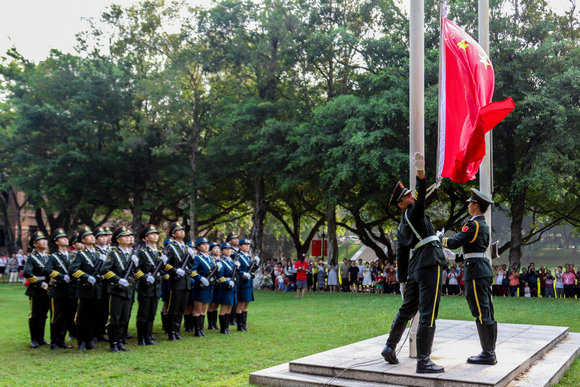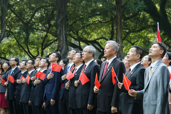旭日東升,秋風(fēng)送爽。10月1日上午,中山大學(xué)在廣州校區(qū)南校園中區(qū)草坪舉行升國旗儀式,師生齊唱國歌,在新中國成立70周年之際,為祖國獻上誠摯祝福。校黨委書記陳春聲,副書記、校長羅俊及師生代表參加升旗儀式?;顒佑尚|h委副書記余敏斌主持。