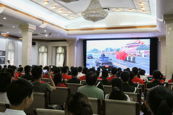 師生代表們前往懷士堂觀看慶祝中華人民共和國成立70周年大會、盛大的閱兵式和群眾游行等活動,感受祖國的繁榮與強大。同學(xué)們紛紛表示,將發(fā)奮努力,不負韶華,讓奮斗成為青春最亮麗的底色,為實現(xiàn)中華民族偉大復(fù)興的中國夢注入青春力量。