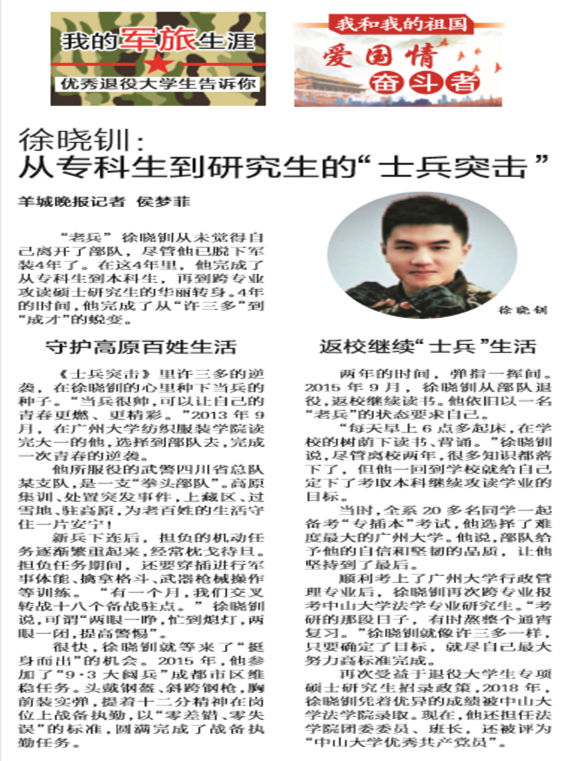 2013年,徐曉釧滿腔赤誠投筆從戎,服役于徐向前元帥部隊改制的武警四川省總隊某支隊。在投身練兵備戰(zhàn)、執(zhí)行急難險重任務(wù)中主動請纓上一線、沖前鋒,培養(yǎng)了不懼苦難、一往無前的血性膽氣和拼搏進取的頑強作風。零差錯、零失誤、高標準圓滿完成2015年“九·三大閱兵”成都市區(qū)維穩(wěn)戰(zhàn)備等任務(wù)。高原集訓(xùn)、處置突發(fā)事件,上藏區(qū)、過雪地、駐高原,經(jīng)常枕戈待旦,為老百姓的生活守住一片安寧!退役后,擔任學(xué)校退役士兵組織干部,擔負民兵訓(xùn)練任務(wù),繼續(xù)為國防建設(shè)發(fā)光發(fā)熱,2018年獲廣州越秀征兵辦頒發(fā)的“當兵光榮”獎。入讀中山大學(xué)法學(xué)院前后,奔赴多所高校參加全省征兵政策暨優(yōu)秀大學(xué)生士兵宣講活動,自覺弘揚踐行愛國奮斗精神,受到省教育廳、省征兵辦的高度肯定和表揚:“發(fā)揚在部隊鍛煉培養(yǎng)出的優(yōu)良作風,傳遞新時代青年勇于擔當、攜筆從戎、矢志報國的正能量?!睙o論是肩扛的鋼槍槍膛內(nèi),還是手執(zhí)的鋼筆筆芯里,裝滿的永遠是火熱的“家國情懷”。