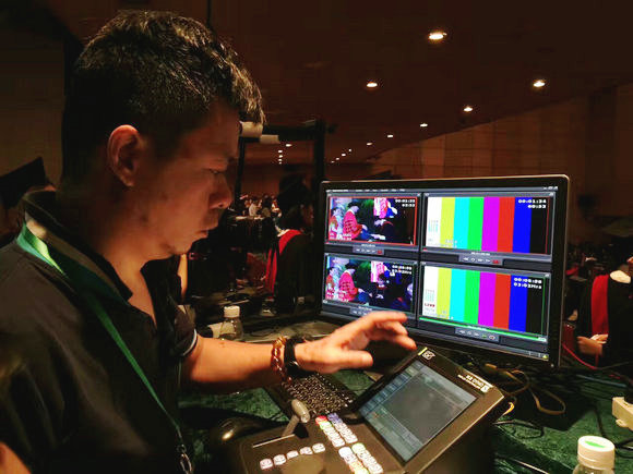 在儀式進(jìn)行過(guò)程中,電視臺(tái)負(fù)責(zé)視頻拍攝、鏡頭切換及現(xiàn)場(chǎng)直播信號(hào)輸出,網(wǎng)絡(luò)與信息技術(shù)中心負(fù)責(zé)視頻網(wǎng)絡(luò)直播、分會(huì)場(chǎng)轉(zhuǎn)播以及后期上傳,兩組人員密切配合,為所有關(guān)注學(xué)位授予儀式的人留下珍貴資料。在主會(huì)場(chǎng)的觀眾可以通過(guò)大屏幕觀禮,在分會(huì)場(chǎng)的觀眾也可通過(guò)實(shí)時(shí)轉(zhuǎn)播共享畢業(yè)的快樂(lè),而在儀式結(jié)束的當(dāng)晚,全程錄像都會(huì)及時(shí)上傳至網(wǎng)站,供大家欣賞與回味。