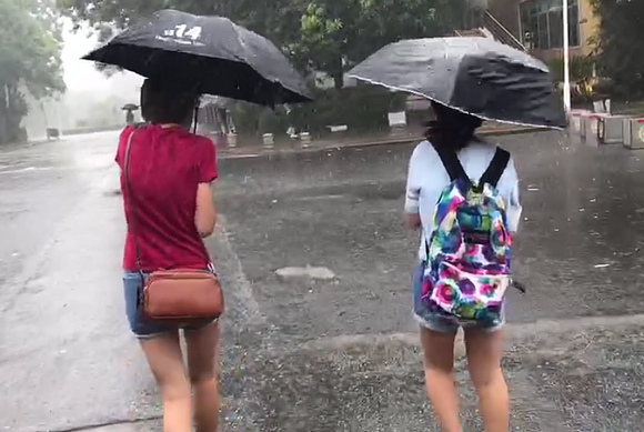 圖為志愿者冒雨迎接新生
