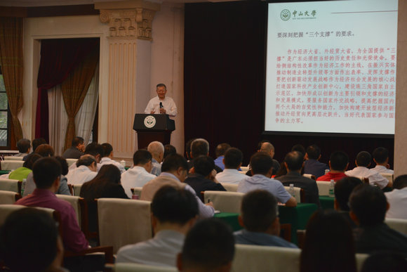 會上,陳春聲書記作了題為“在新的起點(diǎn)上再創(chuàng)新局”的輔導(dǎo)報(bào)告。他首先傳達(dá)了習(xí)近平總書記對廣東工作的重要批示和全省市廳級主要領(lǐng)導(dǎo)干部學(xué)習(xí)貫徹習(xí)近平總書記重要批示精神專題研討班會議精神。他指出,要充分認(rèn)識習(xí)近平總書記重要批示的重大意義,從廣東發(fā)展的關(guān)鍵時刻看,習(xí)近平總書記的重要批示是廣東改革發(fā)展進(jìn)程中具有里程碑意義的大事;從廣東發(fā)展戰(zhàn)略的全局看,重要批示是統(tǒng)領(lǐng)全省工作的重要指針和行動指南;從與實(shí)踐結(jié)合的角度看,重要批示是總書記治國理政新理念新思想新戰(zhàn)略在廣東的展開和具體化,是實(shí)事求是運(yùn)用中國特色社會主義理論指導(dǎo)發(fā)展實(shí)踐的光輝典范。貫徹落實(shí)習(xí)近平總書記重要批示,核心在于深刻把握習(xí)近平總書記重要批示的精神實(shí)質(zhì),其中,“四個堅(jiān)持”是廣東改革發(fā)展的旗幟和原則,“三個支撐”是廣東的使命擔(dān)當(dāng)和發(fā)展路徑,“兩個走在前列”是廣東改革發(fā)展的奮斗目標(biāo)。三者有機(jī)聯(lián)系,相輔相成,層層遞進(jìn),集中體現(xiàn)了對馬克思主義立場觀點(diǎn)方法的自覺運(yùn)用,具有很強(qiáng)的科學(xué)性、真理性、指導(dǎo)性。