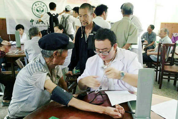 在“百所高校進白山”暑期實踐活動中,羅浩宇為延邊村民義診