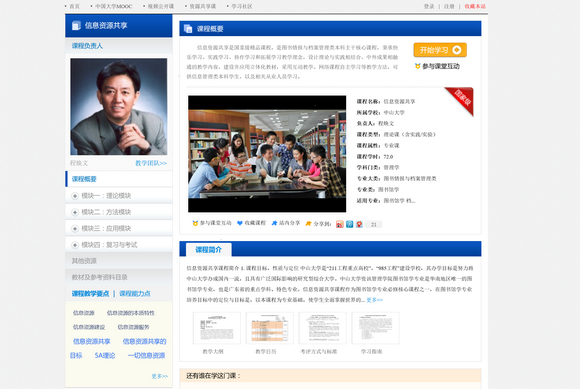 2013年6月,“信息資源共享”課程入選首批國家精品資源共享課程建設項目,并在國家精品開放課程共享平臺 “愛課程”網(wǎng)向公眾開放,成為全國圖書館、情報與檔案管理學科首門上線的國家精品資源共享建設課程,學術影響和社會反響十分廣泛。作為一門圖書館學本科專業(yè)核心課程,到目前為止該課程的訪問量已達到24680次。