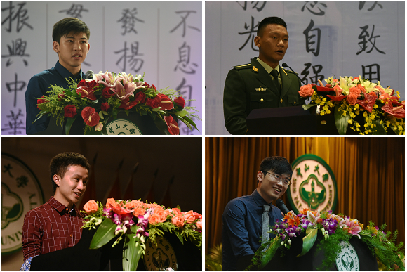 在校學(xué)生代表梁永業(yè)(左上)、旦真次旺(右上)、范杭(左下)、楊樂(右下)分別發(fā)言