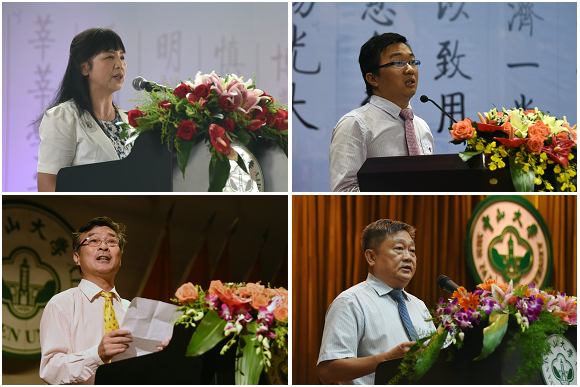 教師代表嶺南學(xué)院教授李勝蘭(左上)、傳播與設(shè)計學(xué)院教授張志安(右上)、哲學(xué)系教授翟振明(左下)、中山醫(yī)學(xué)院教授王庭槐(右下)分別在四場典禮上致辭