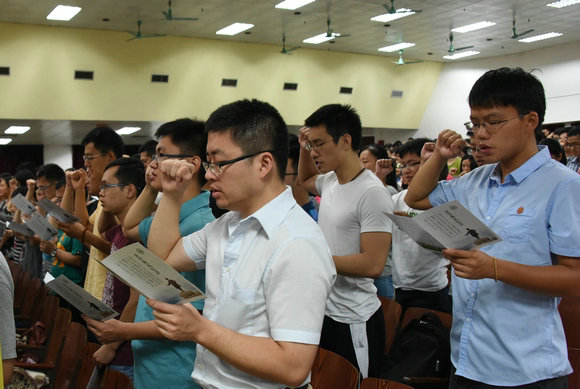 全體醫(yī)科新生舉起右手莊嚴宣誓