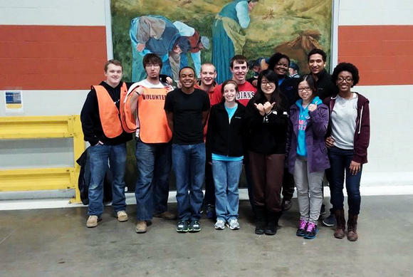 黎子君(右二)在當(dāng)?shù)厥澄镢y行Gleaners Food Bank做志愿者,發(fā)放食物,關(guān)愛貧困者