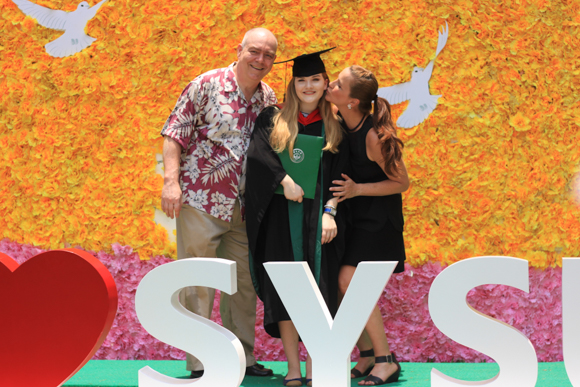 觀禮現(xiàn)場有不少遠道而來的父母,看著自己兒女順利畢業(yè),臉上是藏不住的笑意和欣慰??吹脚畠涸谥写笏哪甑膶W(xué)習(xí)與成長,傳播與設(shè)計學(xué)院2012級學(xué)生曾婉鈺的父母說:“中大的文化沉淀的熏陶和學(xué)術(shù)氛圍很好,非常感激學(xué)校,希望女兒身體力行實踐家國情懷的理念,學(xué)好專業(yè)知識,恪守作為一個記者的職業(yè)操守,為社會弘揚公平公正、為國家發(fā)展貢獻自己的力量?!?br />