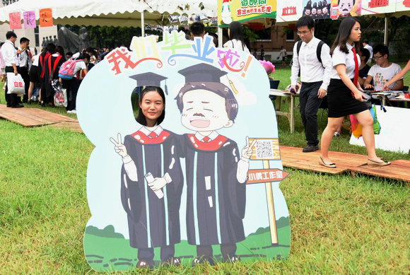 在校友會攤位旁,有一個類似攝影棚的留影區(qū)。一位頭發(fā)有些發(fā)白的中年人手舉“青春”字樣的紙牌,和兩位身著碩士服的畢業(yè)生對著鏡頭合影留念,兩位畢業(yè)生分別舉著“青春就要”、“無所謂”的紙牌。原來,這是校友會今年為畢業(yè)生設計的類似“拍立得”的免費留影區(qū),并對留影背景做了特別設計,還有小胡須或?qū)懹凶值募埮频谰呖晒┻x擇。采訪得知,這位中年人是信息科學與計算學院的沈偉教授,旁邊兩位是他的學生彭韜和袁杰?!案麄冊谝黄?,我感覺自己很青春!”沈偉笑著說。本科期間,彭韜和袁杰的論文指導老師都是沈偉教授,畢業(yè)后,兩人光榮參軍了;兩年后,又重新回到中山大學攻讀碩士學位,機緣巧合,導師仍是沈偉教授?!澳芨蚶蠋煂W習是一輩子的幸福!”彭韜興奮地說。在一旁的袁杰補充道:“特別感謝沈老師的教導。”