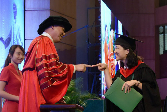環(huán)境科學與工程學院本科畢業(yè)生冼婉姍走到校長面前,與校長來了一次食指碰食指的“E.T.式”手勢互動?!拔蚁牒托iL做朋友?!辟駣櫧忉尩?,“在電影《E.T.》里,小男孩艾里奧特就是通過這種方式和外星人成功交流,最后做成了好朋友。